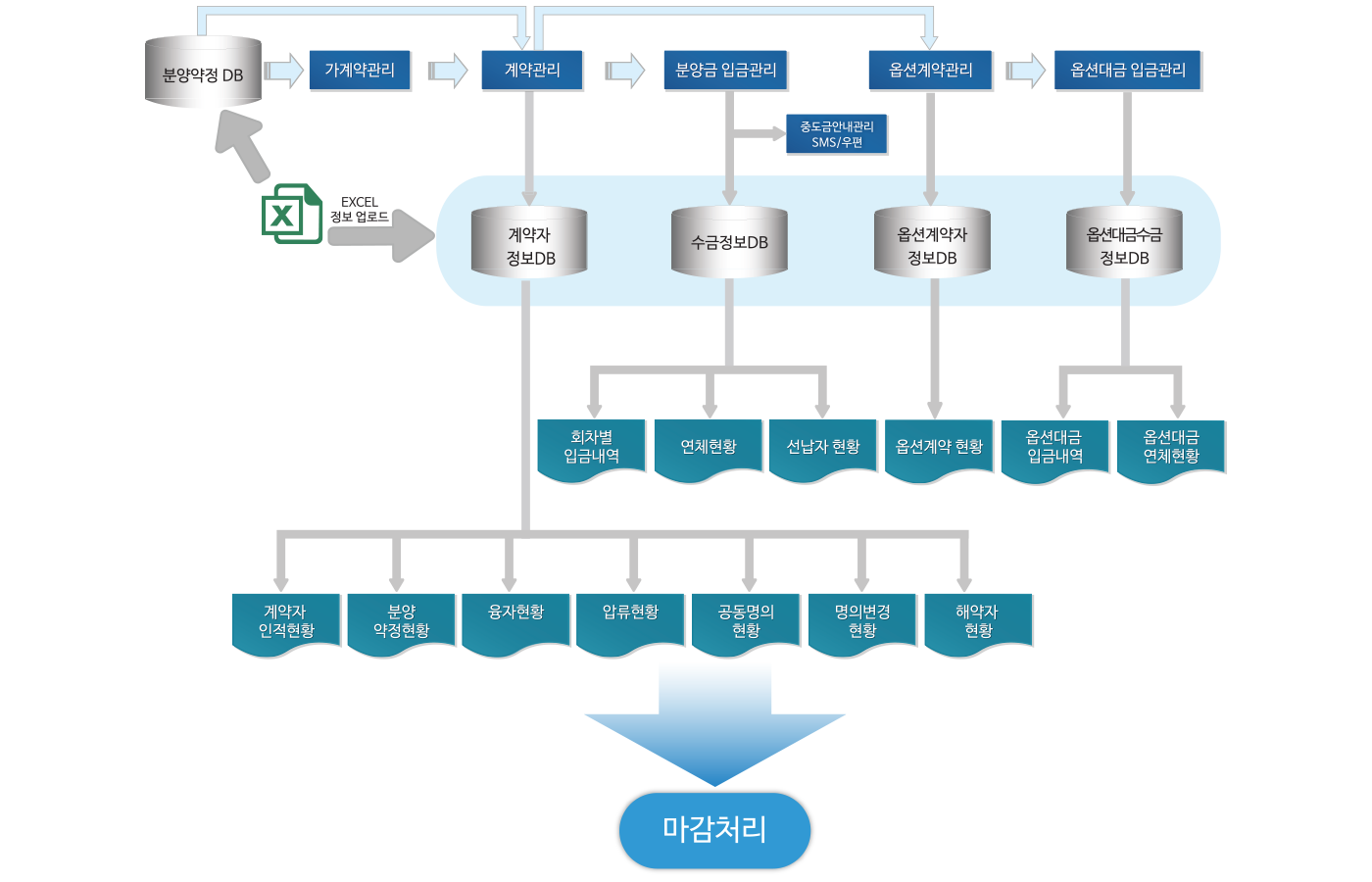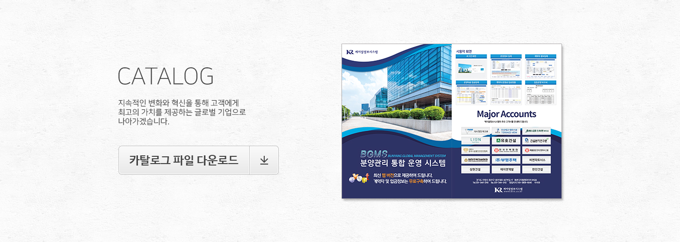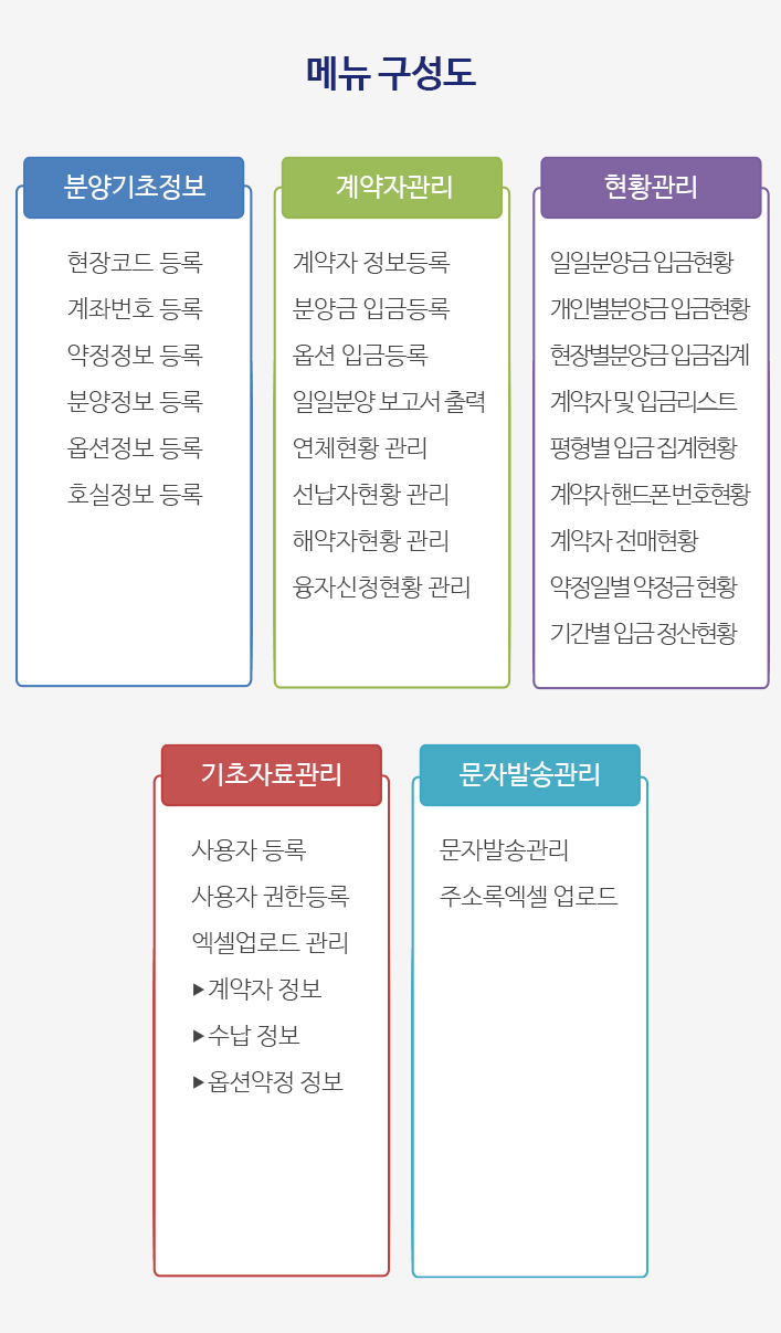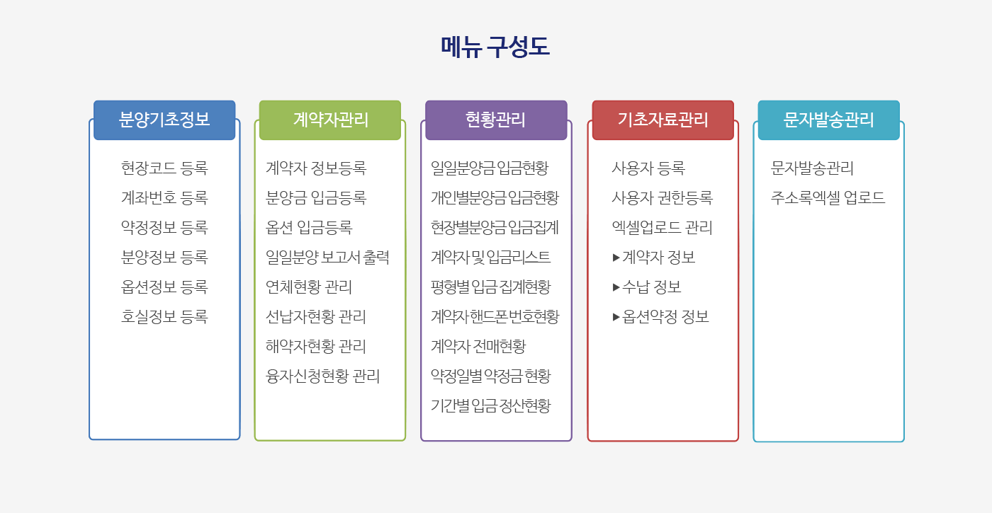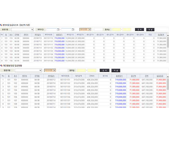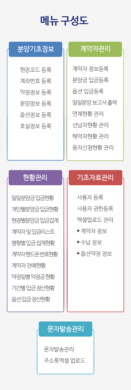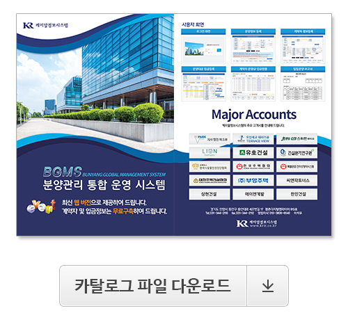 집합건물(아파트, 오피스텔, 오피스, 상가, 도시형 생활주택 등)을 분양할 때 계약자 관리, 분양금 정산관리, 옵션 관리, 연체금 관리 등의 통계업무를 전산 처리하는 분양관리 통합 운영 시스템입니다.