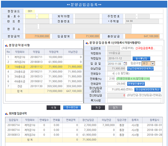 분양금 입금 등록 화면